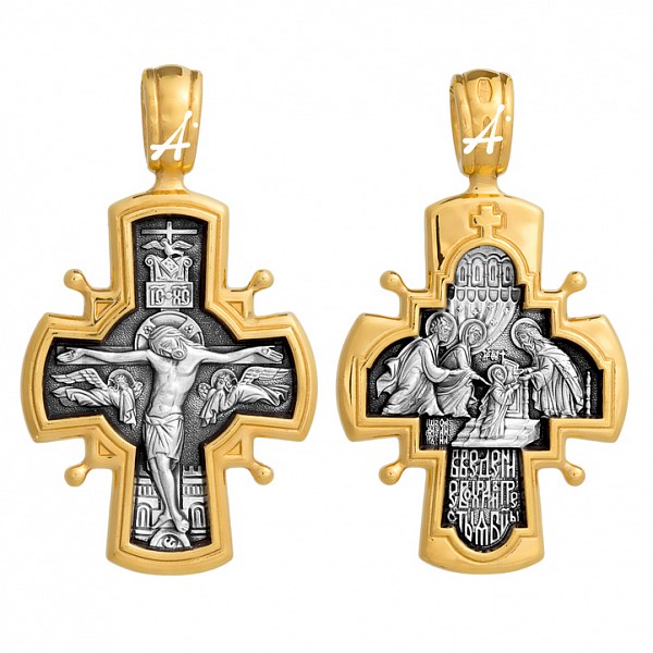 Крест серебрянный, Позолота желтая 999* Чернение (оксидирование), с корундами, Богородица, Акимов, 7.63 гр., арт. ПР.К.000827
