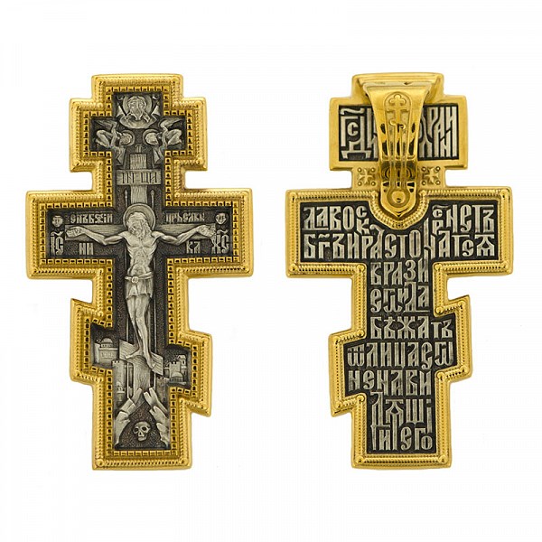 Крест серебрянный, Позолота желтая 999* Чернение (оксидирование), с корундами, Да воскреснет Бог..., Акимов, 9.85 гр., арт. ПР.К.000770