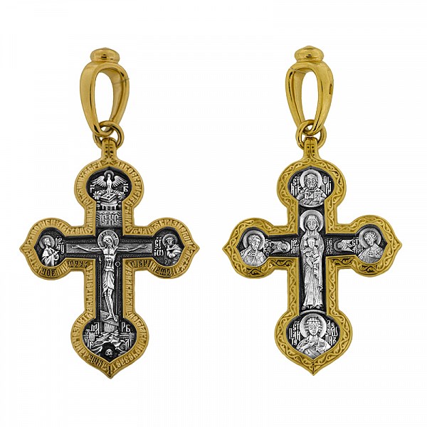 Крест серебрянный, Позолота желтая 999* Чернение (оксидирование), с корундами, Валаамская Божья Матерь, Да воскреснет Бог..., Акимов, 8.78 гр., арт. ПР.К.000764