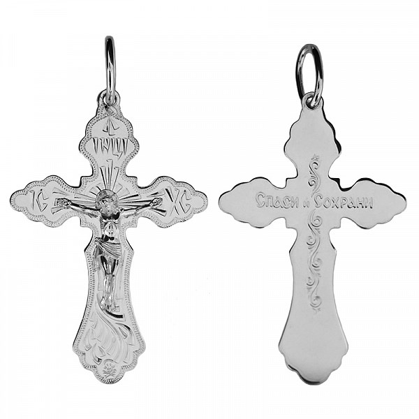 Это освященное православное изделие - Крест из серебра 925 пробы. Произведено по типу: 'Гравировка'. Имеет вставки из корундов. Цвета камней представлены в ассортименте. Если хотите конкретный цвет, то уточните возможность его выбора у менеджера при заказе. Имеет нанесенную молитву Спаси и сохрани. Изделие входит в коллекцию Москва златоглавая-2. Весит, от 4.60 гр.