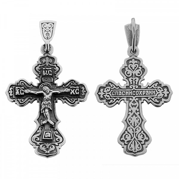 Крест серебрянный, Чернение (оксидирование), с корундами, Спаси и сохрани, Духовное наследие, 3.34 гр., арт. ПР.К.000669