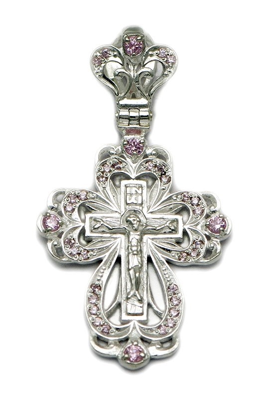 Это освященное православное изделие - Крест из серебра 925 пробы. Произведено по типу литье. Имеет вставки из корундов. Цвета камней представлены в ассортименте. Если хотите конкретный цвет, то уточните возможность его выбора у менеджера при заказе. Изделие входит в коллекцию Иваново. Весит, от 2.55 гр.
