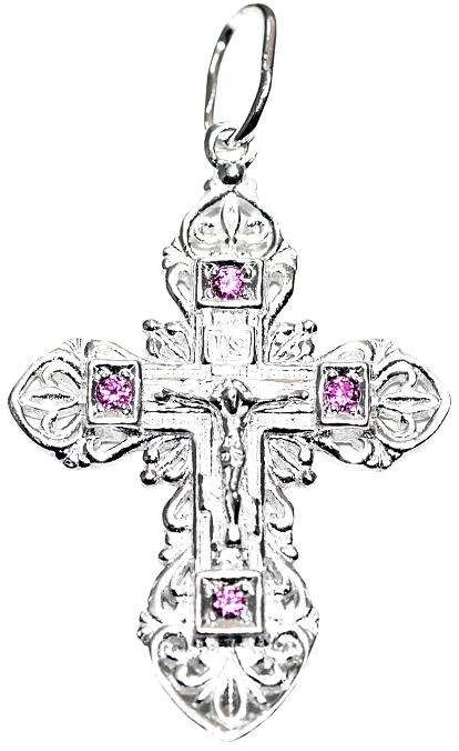 Это освященное православное изделие - Крест из серебра 925 пробы. Произведено по типу литье. Имеет вставки из корундов. Цвета камней представлены в ассортименте. Если хотите конкретный цвет, то уточните возможность его выбора у менеджера при заказе. Изделие входит в коллекцию Иваново. Весит, от 3.32 гр.