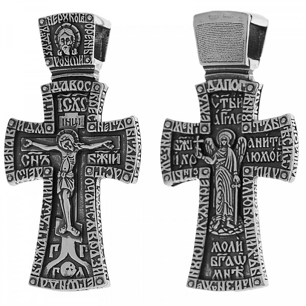 Крест серебрянный, Чернение (оксидирование), с корундами, Ангел-Хранитель, Ангеле Божий, Хранителю мой святый, не остави меня, Спаси и сохрани, 23.31 гр., арт. ПР.К.000350