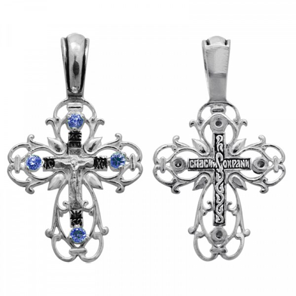 Крест серебрянный, Чернение (оксидирование), с корундами, Спаси и сохрани, коллекция "Санкт-Петербург", 2.83 гр., арт. ПР.К.000334