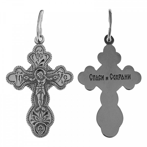 Крест серебрянный, Чернение (оксидирование), с корундами, Спаси и сохрани, 1.58 гр., арт. ПР.К.000236