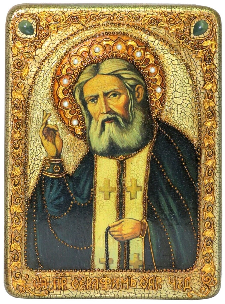 Преподобный Серафим Саровский, в миру Прохор Мошнин, родился 19 июля 1759 года в городе Курске в благочестивой купеческой семье. В 17 лет юноша уже твердо решил оставить мир и мать благословила его на монашеский подвиг. 18 августа 1786 года послушник принял иноческий постриг с именем Серафим. В 1793 году святой Серафим был рукоположен в сан иеромонаха и положил начало подвигу пустынножительства и уединенной молитвы в лесной келлии, на берегу реки Саровки. За любовь к Богу, смирение и подвиги преподобный Серафим сподоблся духовных даров прозорливости и чудотворения. Преподобный старец стал принимать приходящих к нему за благословением, советом и духовным утешением. Серафим Саровский приложил особые усилия к устроению и расширению Дивеевской женской общины. Дата празднования: 15 января, 1 августа . Покровительство святого: Святому Серафиму молятся о защите детей и наставлении их на путь истинный, об исцелении болезней и несчастных случаев, о защите от диких зверей. Церкви: Свято-Троицкий Серафимо-Дивеевский женский монастырь, с. Дивеево . Икона выполнена на натуральной деревянной доске, изготовленной из массива мореного дуба. Образ откопирован с авторского списка методом. получившим одобрение русской православной церкви. При окончательном оформлении образа исользовались специальные фронтажные грунты, выравнивающие лаки и темперные краски. Венец и поля иконы вручную украшены рельефным орнаментом и натуральным жемчугом. К каждой иконе прилагается номерное свидетельство с полной информацией о ней. Каждая икона поставляется в подарочной шкатулке.