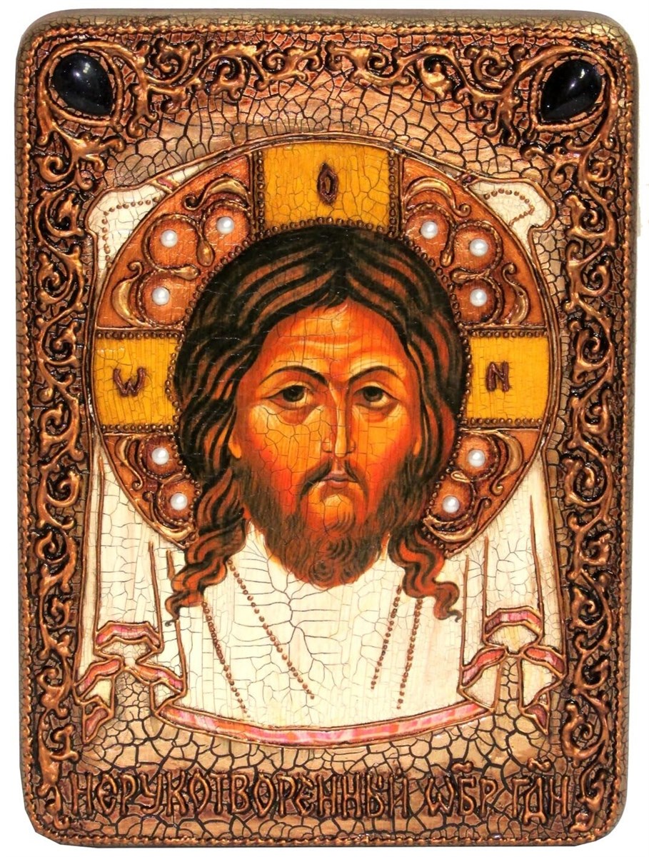 "Спас Нерукотворный" - изображение Нерукотворного Образа Спасителя, запечатленного чудесным образом на куске ткани (плате, полотенце), который в Византии называли «Святым Мандилионом», а в Древней Руси «Святым Убрусом» или «Спасом Нерукотворным». Первые упоминания о существовании Образа относится к концу VI века. В середине X века создается «Повесть о Нерукотворном Образе», в которой излагается два предания о возникновении Нерукотворного образа Спасителя. Согласно первой истории топарх Эдессы по имени Авгарь, страдавший от тяжелых болезней, узнал о чудесах Христа и уверовал в Него. Он отправил Спасителю письмо с просьбой прийти и исцелить его. Своему посланнику Анании, который умел рисовать, Авгарь поручил также сделать портрет Христа. Спаситель, получив письмо, написал ответ, в котором обещал не видевшему Его, но уверовавшему Авгарю исцеление и жизнь вечную, а его городу Эдессе - защиту и неприступность. Кроме того, Христос, «умыв водой лицо, а затем вытерев с него влагу поданным Ему полотенцем, соизволил божественным и неизреченным образом запечатлеть на нем Свои черты». Письмо и плат с Нерукотворным Образом были даны Анании для Авгаря, чтобы тот получил избавление от страданий и болезни. Другое предание о возникновении Мандилиона напоминает о страстях Господних. Нерукотворный Образ возникает во время молитвы в Гефсиманском саду. «И Сам отошел от них на вержение камня, и, преклонив колени, молился, говоря: Отче! о, если бы Ты благоволил пронести чашу сию мимо Меня! впрочем не Моя воля, но Твоя да будет. Явился же Ему Ангел с небес и укреплял Его. И, находясь в борении, прилежнее молился, и был пот Его, как капли крови, падающие на землю» (Лк. 22: 41-44). Тогда, по преданию взяв у одного из учеников кусок ткани, Он вытер им ручейки пота, и тотчас отпечатался Его боговидный образ. После Вознесения Христа апостол Фома передал Нерукотворный Образ апостолу Фаддею, которого он послал к Авгарю во исполнение обещания Христа. При виде апостола, принесшего Мандилион, Авгарь мгновенно исцелился, возложив плат себе на голову, глаза и уста. Он изучил «отпечаток образа на льне» и поразился его чудотворной силе, а апостол Фаддей рассказал ему об «изображении без красок от пота». Апостол Фаддей, совершив множество чудес и исцелив всех больных в Эдессе, крестил Авгаря и его семью. Новокрещеный властитель Эдессы прославил Нерукотворный Образ. Он прикрепил его к доске, украсил золотом, написав на образе слова: «Христе Боже, надеющийся на Тебя не погибнет», и установил перед главными воротами города на том месте, где ранее находилась статуя почитаемого греческого божества. И каждый должен был поклониться «чудотворному образу Христа» как новому небесному покровителю града. Однако внук Авгаря отступил от христианства и решил уничтожить Нерукотворный Образ над воротами города. Узнав об этом, епископ Эдессы закрыл «полукруглую нишу» с Мандилионом черепицей, предварительно поставив перед Нерукотворным Образом светильник. О спрятанном Образе забыли. Мандилион был вновь обретен во время осады Эдессы персами в 544 году, когда епископу Евлалию явилась ночью «некая прекрасная вооруженная жена», которая открыла ему местонахождение Нерукотворного Образа. Евлалий нашел Мандилион неповрежденным, а находившийся рядом с ним светильник непогасшим. Епископ, подняв