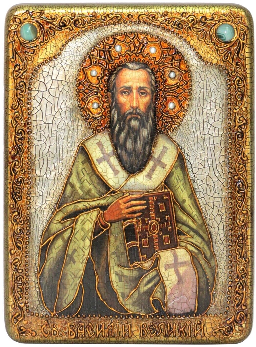 Святитель Василий Великий, архиепископ Кесарии Каппадокийской, "принадлежит не одной Кесарийской Церкви, и не в свое только время, не одним соплеменникам своим был полезен, но по всем странам и градам вселенной, и всем людям приносил и приносит пользу, и для христиан всегда был и будет учителем спасительнейшим", - так говорил современник святителя Василия, святой Амфилохий, епископ Иконийский. Родился Василий около 330 года в Кесарии, административном центре Каппадокии, и происходил из известного рода, славившегося как знатностью и богатством, так и дарованиями и ревностью христианской веры. Дед и бабка святителя со стороны отца во время гонения Диоклетиана должны были скрываться в лесах Понта в течение семи лет. Мать святого Василия, Емилия, была дочерью мученика. Отец святителя, также по имени Василий, адвокат и известный преподаватель риторики, постоянно жил в Кесарии. В семье было десять человек детей, пять сыновей и пять дочерей, из них пятеро были потом причислены к лику святых: Василий, Макрина - образец аскетической жизни, оказавшая сильное влияние на жизнь и характер святого Василия Великого, Григорий, впоследствии епископ Нисский, Петр, епископ Севастийский, и праведная Феозва - диакониса. Первые годы жизни святой Василий провел в принадлежавшем его родителям поместье на реке Ирисе, где воспитывался под руководством матери и бабки Макрины, высокообразованной женщины, сохранившей в памяти предание о знаменитом святителе Каппадокии – Григории Чудотворце. Первоначальное образование Василий получил под руководством отца, затем он обучался у лучших учителей Кесарии Каппадокийской, где познакомился со святым Григорием Богословом, а позже перешел в школы Константинополя, где слушал выдающихся ораторов и философов. Для завершения образования святой Василий отправился в Афины - центр классического просвещения. После четырех или пяти лет пребывания в Афинах Василий Великий обладал всеми доступными знаниями: "Он так изучил всё, как другой не изучает одного предмета, каждую науку он изучил до такого совершенства, как будто не учился ничему другому". Философ, филолог, оратор, юрист, естествовед, имевший глубокие познания в астрономии, математике и медицине, - "это был корабль, столь нагруженный ученостью, сколь сие вместительно для человеческой природы". В Афинах между Василием Великим и Григорием Богословом установилась теснейшая дружба, продолжавшаяся всю жизнь. Позднее, в похвальном слове Василию Великому, святитель Григорий Богослов восторженно говорил об этом времени: "Нами руководили равные надежды и в деле самом завидном - в учении. Нам известны были две дороги: одна - к нашим священным храмам и к тамошним учителям; другая - к наставникам наук внешних". . Около 357 года святой Василий возвратился в Кесарию, где некоторое время преподавал риторику. Но вскоре, отказавшись от предложения кесарийцев, желавших поручить ему обучение юношества, святой Василий вступил на путь аскетической жизни. После смерти мужа мать Василия со старшей дочерью и несколькими девственницами удалились в фамильное поместье на реке Ирисе и вели подвижническую жизнь. Василий же, приняв Крещение от епископа Кесарийского Диания, был поставлен чтецом. Как истолкователь Священных Книг, он сначала читал их народу. Затем, "желая снискать руководителя к 
