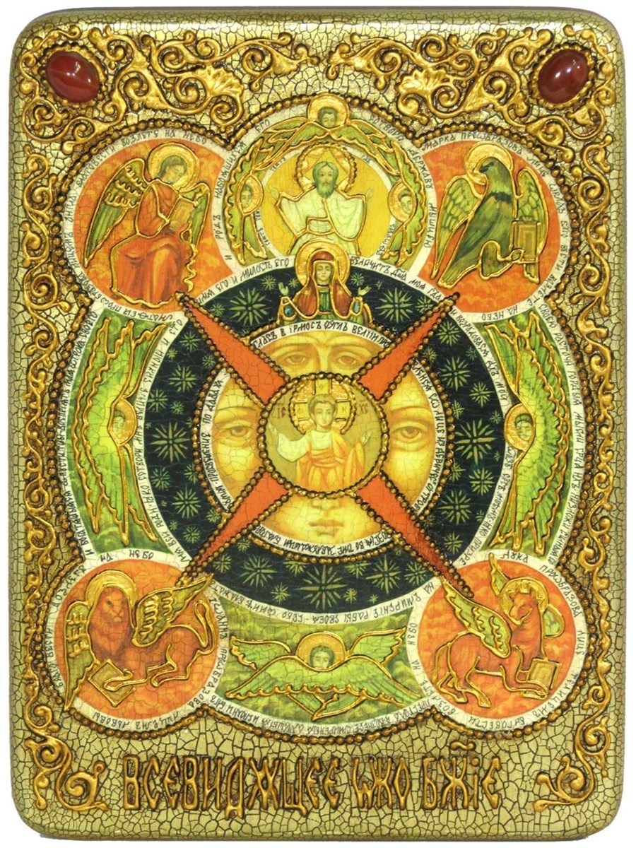 Среди христианских икон есть известные, особо популярные в народе, а есть и редкие. Но сила их от этого не только не меньше - по своему могуществу такие образа превосходят даже самые известные и намоленные. Икона «Всевидящее Око» довольно загадочна и не очень понятна обычному верующему человеку. Объясняется это сложным её рисунком, метафоричность и символическое значение которого требуют специального пояснения. В основе сюжета образа лежат библейские пророческие слова о недремлющем Божьем глазе, который надзирает над грешными, Его боящимися, и над теми христианами, которые уповают на Его милость и всепрощение. По сути, икона «Всевидящее Око» в аллегорической форме изображает мироздание с точки зрения христианской идеологии. В ней переданы сущность и самого Господа, и Духа Святого, и Богородицы, и Иисуса. Поэтому образ является всеобъемлющим, глобальным. И если для других икон существуют специальные молитвы, акафисты, через которые следует обращаться за помощью к высшим силам, то икона «Всевидящее Око» универсальна по сути. Перед нею можно молиться, как подсказывает сердце, как лежит душа, обо всём, что наболело. Богомольцы в любой ситуации обращаются к Богу, который надзирает над миром с высоты, всё ведает, над всем наблюдает, во всё вникает. Нет предела знаниям, и даже самый потаённый уголок сердца открыт для глаз Божьих и понятен совершенно. Икона «Всевидящее Око» отражает то идеальное мироустройство, которое должно быть установлено в царстве Божьем. В самом верху изображения находится Христос. Поднятая его рука застыла в благословляющем жесте. Образ Господа заключён в круг, как в Солнце. Усиливают сравнение и расходящиеся лучи. В этом плане икона «Всевидящее Око» значение имеет следующее: Господь - солнце, освещающее и согревающее мир, изливающее на него благодать свою. Далее идёт второй круг, в котором изображены людские лица, - они олицетворяют то самое человечество, на которое Благодать направлена. В третьем круге находится Богородица, молитвенно сложившая руки. В народе, в богословии она олицетворяет заступницу всех страждущих перед строгим судом Божьим. И, наконец, круг четвёртый - икона «Всевидящее Око Божие» содержит и его. Это идейно-смысловой центр композиции. Тут находится сам Спаситель, окружённый ангелами на фоне звёзд - воплощение высшей чистоты и духовности, истины в чистом виде. Оказаться там, рядом с Богом - значит, пройти до конца весь путь испытаний. Господь - начало всего, источник жизни физической и духовной. Христос - свет правды, а Мать Божья - кроткая заступница всего человеческого рода. Таков сакральный смысл образа. Списков иконы «Всевидящее око» существует множество, это знают те, кто прибегает к её помощи. При любой беде, нужде, проблеме можно обращаться к иконе. Плохое самочувствие, недоразумения с родными, на работе, улаживание конфликтных ситуаций и многие другие невзгоды позволяет наладить икона. Естественно, молитвы должны быть искренними, горячими, страстными, душевными. Икона выполнена на натуральной деревянной доске, изготовленной из массива мореного дуба. Образ откопирован с авторского списка методом. получившим одобрение русской православной церкви. При окончательном оформлении образа использовались специальные фронтажные грунты, выравнивающие лаки и темперные краски. Венец и поля 