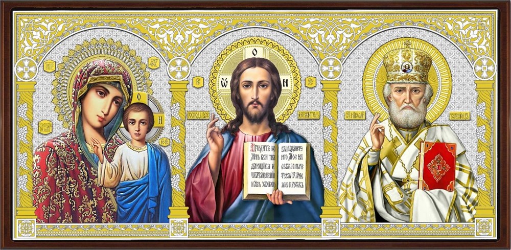 Когда такая икона находит своё место в доме, она меняет пространство вокруг — тихо, без слов, но ощутимо. Триптих с Богородицей, Спасителем и Николаем Чудотворцем собирает под одним окладом тех, к кому обращаются чаще всего. Здесь молитва о детях, о дороге, о самом важном — всё рядом, в одном образе.