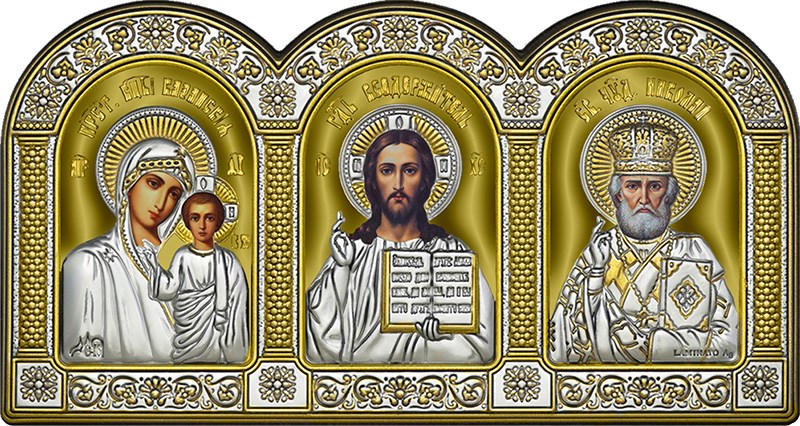 Триптих объединяет три образа под одной золотой аркой. Слева — Казанская Богородица с Младенцем, в центре — Спаситель с раскрытым Евангелием, справа — Николай Чудотворец. Каждый лик обрамлён серебром, а между ними — узорчатые перегородки, как окна между алтарями.