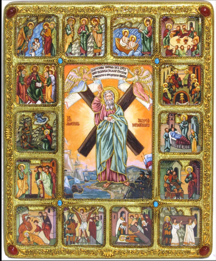 Большая подарочная икона "Святой апостол Андрей Первозванный с житийными сценами" на мореном дубе 37х30, арт. 20584