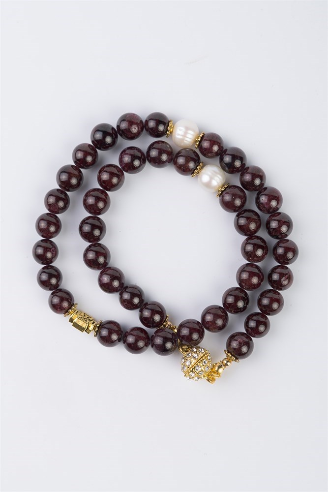 Четки-браслет из натурального Граната и речного жемчуга. 40 зерен. Диаметр бусины 7-8 мм. Замок со стразами. Фурнитура на браслете- ювелирный сплав. Собраны на ювелирный трос. Одеваются на руку двойной обмоткой. ГранатС древности многие народы почитали гранат как каменьобладающий лечебными свойствами. Крестоносцыс целью защиты от ран и болезниносили перстниинкрустированные гранатами. Неспроста этому камню приписывали умение избавлять от боли. На Руси было поверьечто гранат способен помочь женщине в родах. В Индии полагаличто самоцвет делится энергией с легкими и сердцемподдерживает иммунитет организма. Гранат положительно влияет на эмоциональное состояние человекапомогает при нарушении обмена веществстабилизирует деятельность сердца. Самоцвет способен остановить воспалительный процесс. Минерал будет способствовать заживлению ранрегенерации тканей и органовбудет стимулировать кровообращение и повысит потенцию. Современные литотерапевты говорятчто при заболеваниях легочной системы гранатоправленный в серебронеобходимо носить на шее. Гранат в золотой оправеносимый в кольце на правой рукеспособен помочь при заболеваниях горлаголовных болях и высокой температуре. ЖемчугЖемчуг считается одним из самых дорогих драгоценных камнейхотястрого говорякамнем не является – это органическое образованиезарождающееся в телах некоторых морских и речных моллюсков в результате попадания туда инородного предмета. Жемчуг состоит и из минерального –карбоната кальцияи из органического – конхиолина – веществсочетание которых и называется перламутром. Тонкие перламутровые слои рождают идеальную сферическую жемчужину. Промышленная добыча жемчуга относится ко II веку до н. э. Красота жемчужин издавна пленяла царей и особенно царицвокруг него витало множество легендно интересночто ни одна из старинных жемчужин до наших дней не дошлапотому что век жемчугакак органического образованиянедолог – они хранятся всего 150-200 лет. Люди замечаличто жемчуг имеет свойство индикатора состояния здоровья человека. По некоторым исследованиям был сделан выводчто жемчужиныкоторые подвергаются воздействию потовых желёз (пот имеет кислую реакцию)а также косметикитускнеют. Также ему приписывали дар облегчения от гипертонииот болезней почекжелудкапеченикишечника. Изделия из жемчуга – такиекак браслетыкольцаожерельячетки – не следует хранить в теплых местахзаворачивать в шерстяную тканьтак как это способствует их усыханию.