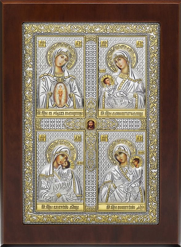 Четыре образа Богородицы собраны здесь в одном окладе — тонкие серебряные линии обрамляют каждый лик, и кажется, будто смотришь на четыре окна в одну и ту же тайну материнства, только открытую с разных сторон. Помощь в родах, защита младенца, утешение в болезни — всё то, с чем женщины шли к Богородице веками, всё здесь, в этих четырех образах.
