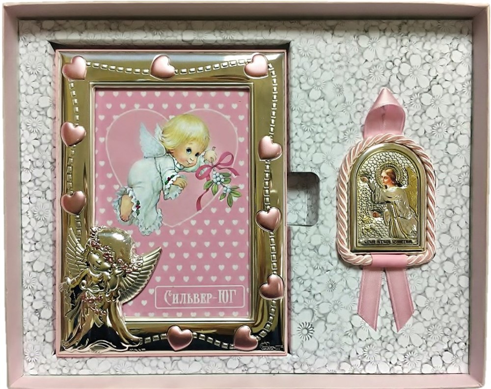 Детский Набор (Фоторамка+Подвесная Икона Ангела-Хранителя В Единой Подарочной Коробке). Цвет – Розовый, арт. SIL489