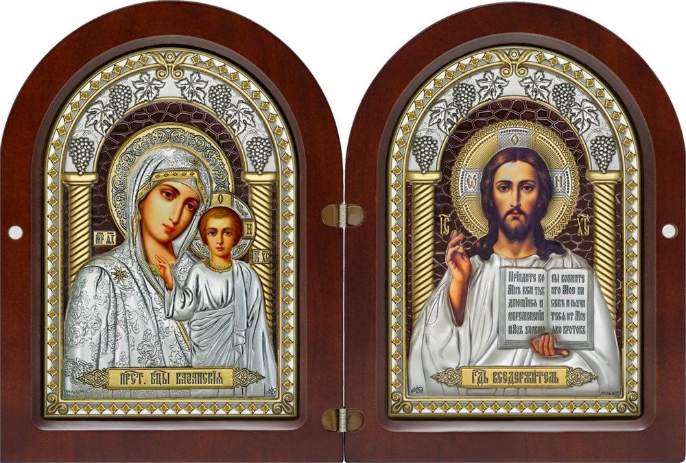 Казанская Богородица склоняется к Младенцу. Христос Вседержитель держит раскрытое Евангелие и благословляет. Два образа рядом, в одном пространстве. Створки закрываются — и святыни под защитой, можно нести с собой.