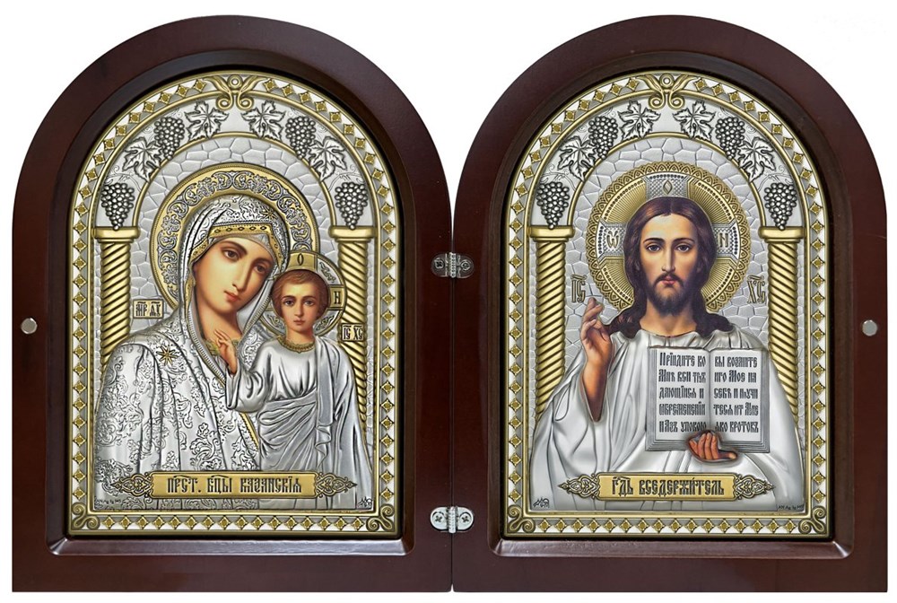 Свет падает на створки, и серебристый оклад отражает его мягко, без блеска. Виноградные гроздья идут по краю обеих икон — слева Казанская Божия Матерь, справа Спаситель. Арочные завершения повторяют форму храмовых окон. Дерево рамы тёмное, плотное, приятное глазу.
