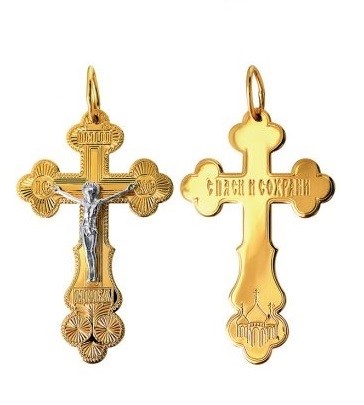 Это освященное православное изделие - Крест из золота 585 пробы. Имеет алмазную и лазерную огранку. Если хотите конкретную обработку, то уточните возможность ее выбора у менеджера при заказе. Весит, от 4,18 гр.