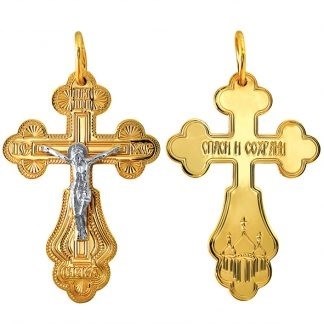 Это освященное православное изделие - Крест из золота 585 пробы. Имеет алмазную и лазерную огранку. Если хотите конкретную обработку, то уточните возможность ее выбора у менеджера при заказе. Весит, от 2,8 гр.
