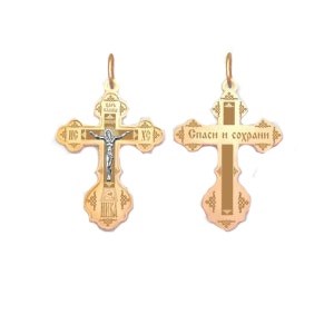 Это освященное православное изделие - Крест из золота 585 пробы. Имеет алмазную и лазерную огранку. Если хотите конкретную обработку, то уточните возможность ее выбора у менеджера при заказе. Весит, от 1,74 гр.