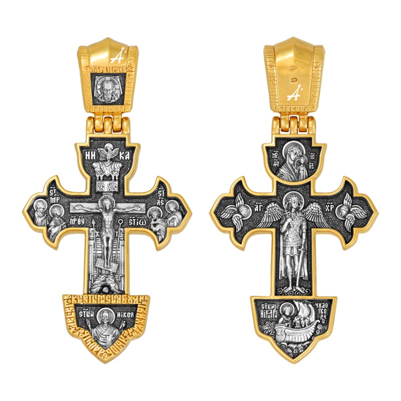 Крест позолоченный Ag 925/Au 585, коллекция Акимов, лик Ангел-Хранитель, Николай Чудотворец, Позолота желтая 999*, Чернение (оксидирование), 19,66 гр., арт. КРС02241728