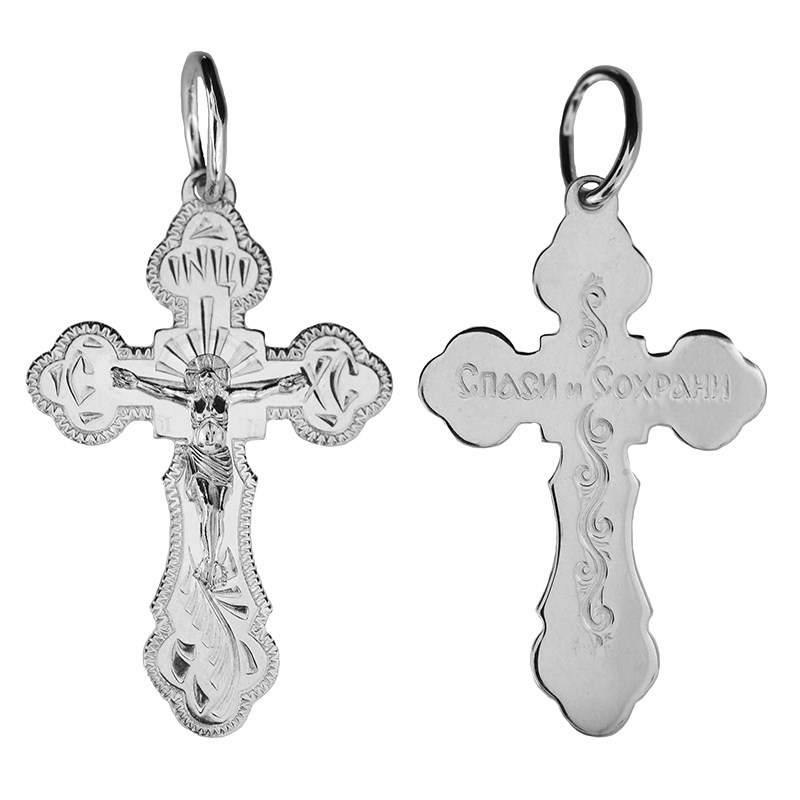Это Освященное Православное изделие - Крест, из Серебро Ag 925. Изделие входит в коллекцию: 'Москва златоглавая-2'. Произведено по типу: 'Гравировка'. Украшена ювелирными камнями. Данные по их ассортименту можно уточнить у менеджера. Изделие имеет высоту 4,5 см. Изделие имеет ширину 2,5 см. Освящен молитвой: ' Спаси и сохрани'. Весит, от 3.55 гр.