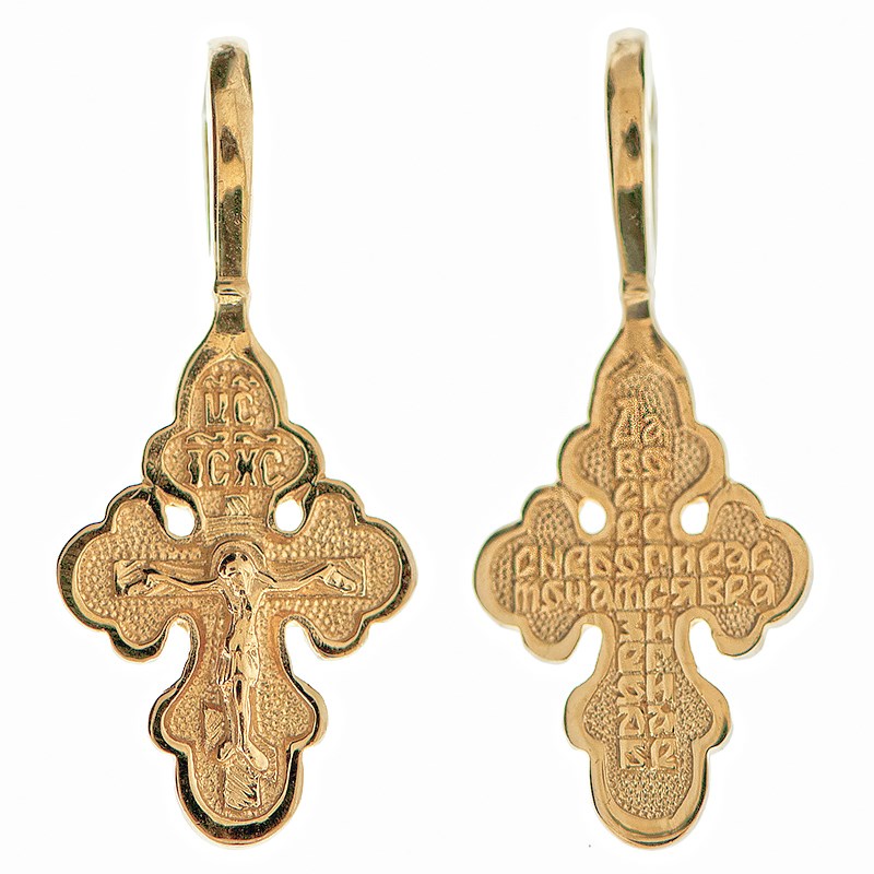 Это Освященное Православное изделие - Крест, из Золото Au 585. Изделие входит в коллекцию: 'Золотая филигрань'. Произведено по типу: 'Литье'. Изделие имеет высоту 2 см. Изделие имеет ширину 0,9 см. Освящен молитвой: ' Да воскреснет Бог...'. Весит, от 0.85 гр.