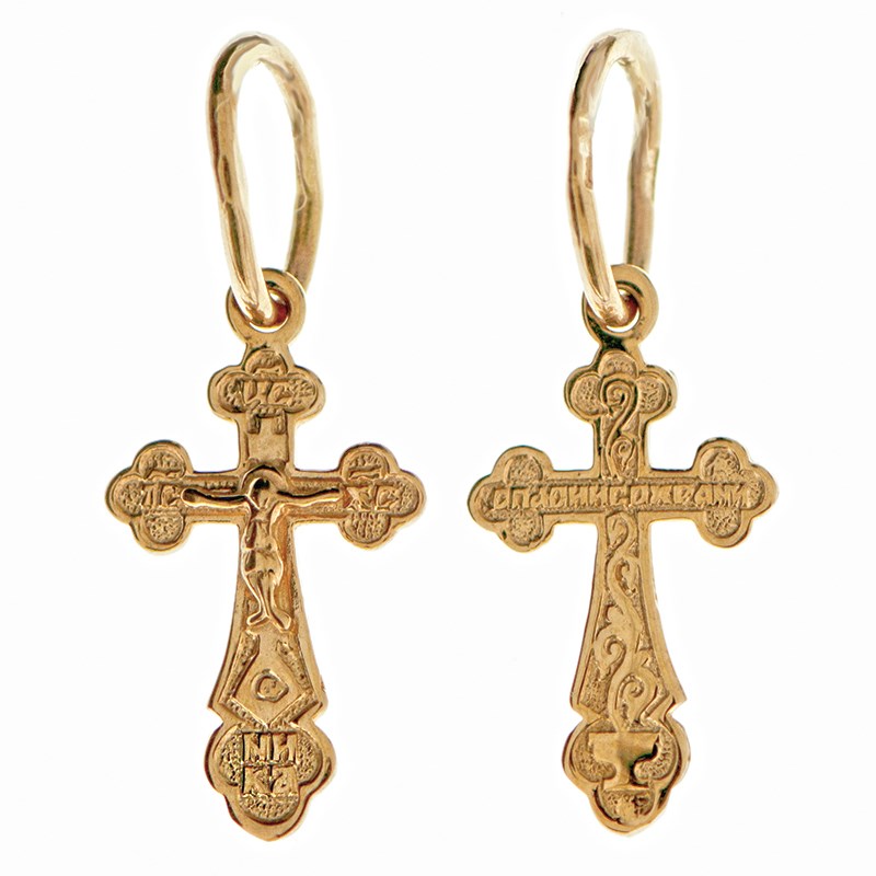 Это Освященное Православное изделие - Крест, из Золото Au 585. Изделие входит в коллекцию: 'Золотая филигрань'. Произведено по типу: 'Литье'. Изделие имеет высоту 2 см. Изделие имеет ширину 0,8 см. Освящен молитвой: ' Спаси и сохрани'. Весит, от 0.46 гр.