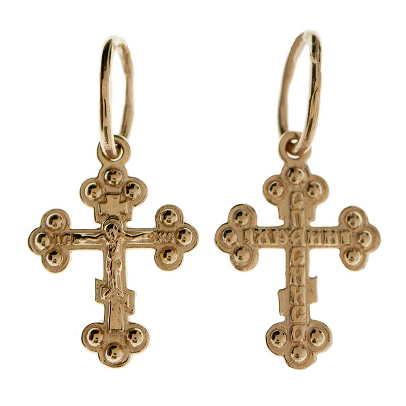 Это Освященное Православное изделие - Крест, из Золото Au 585. Изделие входит в коллекцию: 'Золотая филигрань'. Произведено по типу: 'Литье'. Изделие имеет высоту 2 см. Изделие имеет ширину 1,1 см. Освящен молитвой: ' Спаси и сохрани'. Весит, от 0.84 гр.