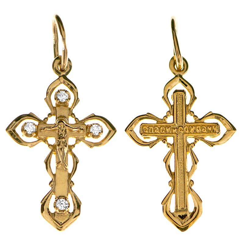 Это Освященное Православное изделие - Крест, из Золото Au 585. Изделие входит в коллекцию: 'Золотая филигрань'. Произведено по типу: 'Литье'. Украшена ювелирными камнями. Данные по их ассортименту можно уточнить у менеджера. Изделие имеет высоту 3 см. Изделие имеет ширину 1,5 см. Освящен молитвой: ' Спаси и сохрани'. Весит, от 1.73 гр.