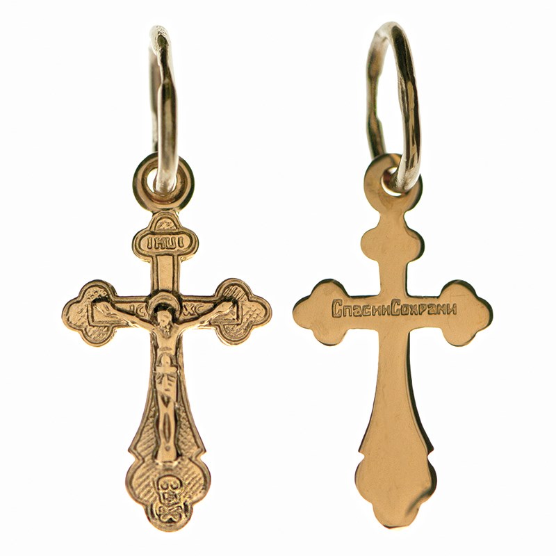 Это Освященное Православное изделие - Крест, из Золото Au 585. Изделие входит в коллекцию: 'Золотая филигрань'. Произведено по типу: 'Штамп'. Изделие имеет высоту 2 см. Изделие имеет ширину 0,9 см. Освящен молитвой: ' Спаси и сохрани'. Весит, от 0.51 гр.