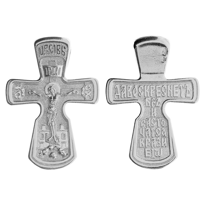 Это Освященное Православное изделие - Крест, из Серебро Ag 925. Изделие входит в коллекцию: 'Иваново'. Произведено по типу: 'Литье'. Украшена ювелирными камнями. Данные по их ассортименту можно уточнить у менеджера. Изделие имеет высоту 3,5 см. Изделие имеет ширину 2,5 см. Освящен молитвой: ' Да воскреснет Бог...'. Весит, от 6.66 гр.