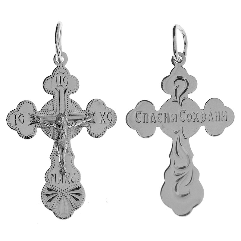 Это Освященное Православное изделие - Крест, из Серебро Ag 925. Изделие входит в коллекцию: 'Москва златоглавая-2'. Произведено по типу: 'Гравировка'. Украшена ювелирными камнями. Данные по их ассортименту можно уточнить у менеджера. Изделие имеет высоту 3,5 см. Изделие имеет ширину 2 см. Освящен молитвой: ' Спаси и сохрани'. Весит, от 2.04 гр.