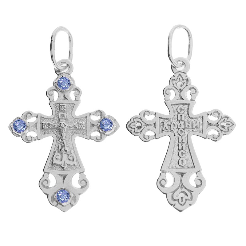 Это Освященное Православное изделие - Крест, из Серебро Ag 925. Изделие входит в коллекцию: 'Иваново'. Произведено по типу: 'Литье'. Украшена ювелирными камнями. Данные по их ассортименту можно уточнить у менеджера. Изделие имеет высоту 3,2 см. Изделие имеет ширину 2 см. Весит, от 1.56 гр.