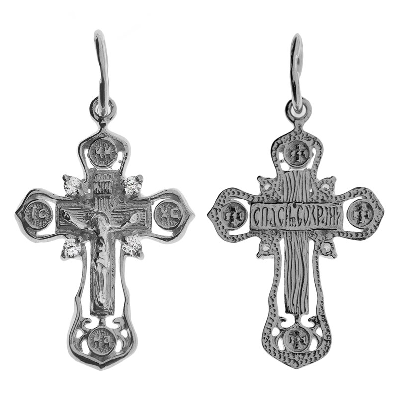 Это Освященное Православное изделие - Крест, из Серебро Ag 925. Изделие входит в коллекцию: 'Царь Славы'. Украшена ювелирными камнями. Данные по их ассортименту можно уточнить у менеджера. Изделие имеет высоту 2,7 см. Изделие имеет ширину 1,4 см. Весит, от 1.25 гр.