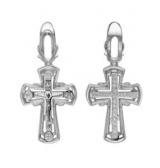 Это Освященное Православное изделие - Крест, из Серебро Ag 925. Изделие входит в коллекцию: 'Аксиос'. Украшена ювелирными камнями. Данные по их ассортименту можно уточнить у менеджера. Изделие имеет высоту 2,7 см. Изделие имеет ширину 1,3 см. Освящен молитвой: ' Спаси и сохрани'. Весит, от 1.87 гр.