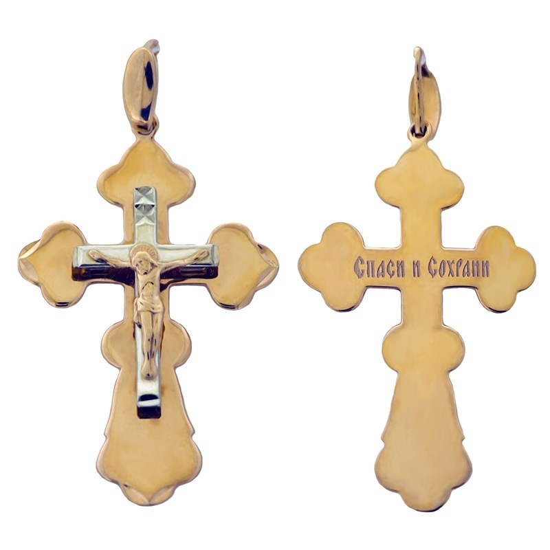 Это Освященное Православное изделие - Крест, из Золото Au 585. Изделие входит в коллекцию: 'Православие'. Изделие имеет высоту 3,9 см. Изделие имеет ширину 2,1 см. Весит, от 2.43 гр.