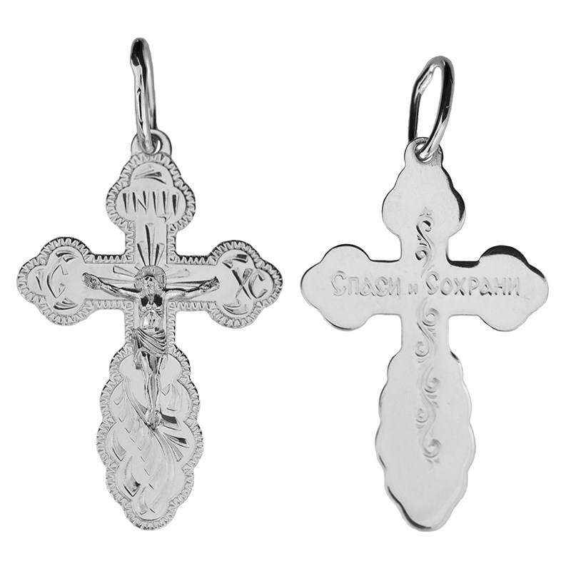 Это Освященное Православное изделие - Крест, из Серебро Ag 925. Изделие входит в коллекцию: 'Москва златоглавая-2'. Произведено по типу: 'Гравировка'. Украшена ювелирными камнями. Данные по их ассортименту можно уточнить у менеджера. Весит, от 3.65 гр.