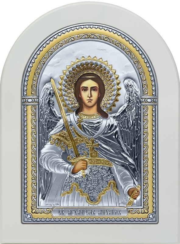 Эта икона создаёт в доме особое чувство — будто кто-то незримо стоит на страже, и можно спокойно дышать. Архангел Михаил изображён с мечом и сферой, его крылья распахнуты, а золотой нимб сияет за ликом. В серебряном окладе с позолотой столько света, что образ кажется живым.