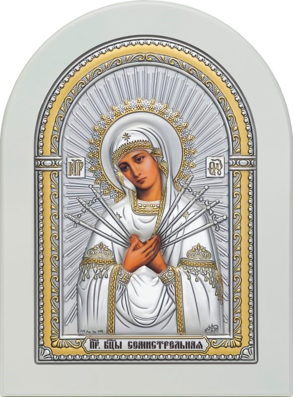 Лик Богородицы нежен и сосредоточен, руки сложены на груди. От нимба расходятся семь лучей — свет, пробивающийся сквозь скорбь. Серебряный оклад с золочением обрамляет образ бережно, подчёркивая каждую деталь, каждую линию, в которой читается не только страдание, но и готовность нести его ради мира.