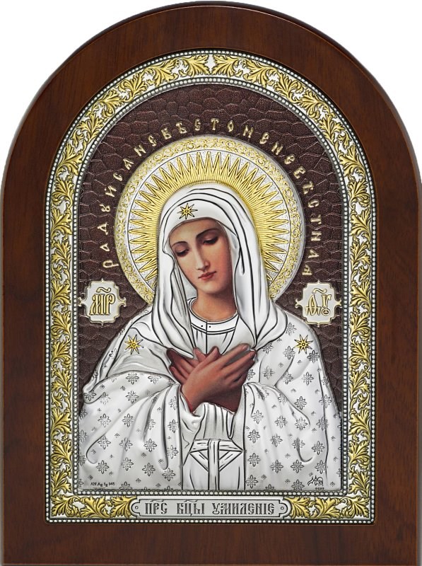 Светлый оклад с золотым узором не кричит о себе. Он мягко обнимает лик, оставляя главным взгляд — спокойный, без лишних слов.