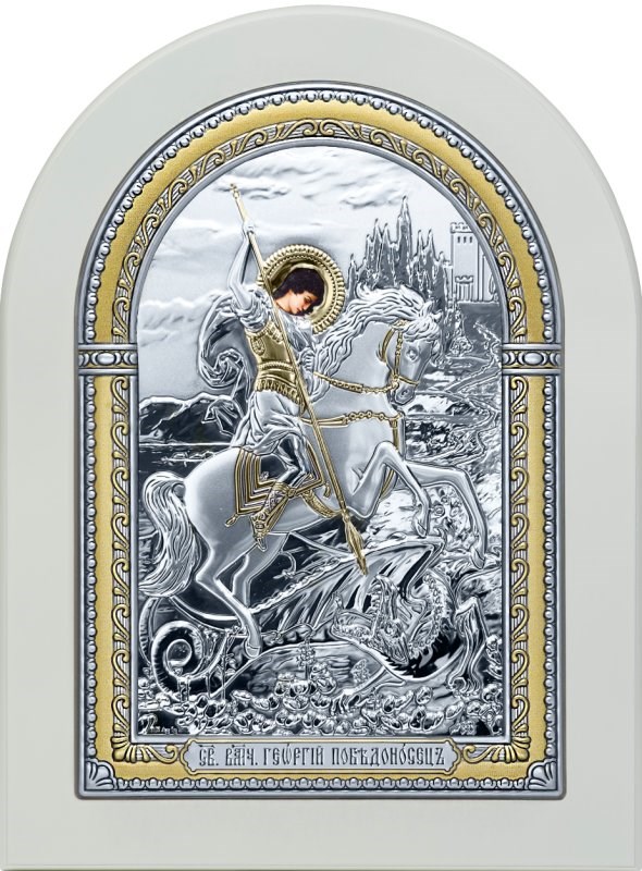 Оклад здесь — не просто украшение. Золотая рамка с орнаментом, серебряный рельеф, белый фон — всё это создаёт ощущение, что перед тобой не картинка, а окно в другой мир. Мир, где победа уже свершилась.