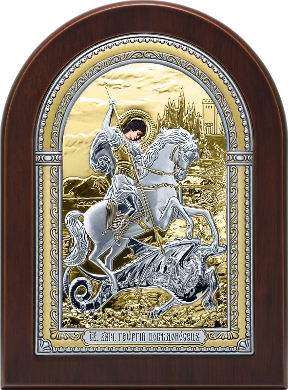 Серебряный всадник на белом коне застыл над поверженным змием — каждая линия чеканного рельефа словно движется, даже когда икона просто стоит перед глазами. Золотой фон мерцает за фигурой святого Георгия, а за его спиной угадываются очертания города, который он спасает от чудовища. Образ древний, но до сих пор живой — потому что в нём не только победа над злом, но и то мужество, которое нужно каждому из нас.