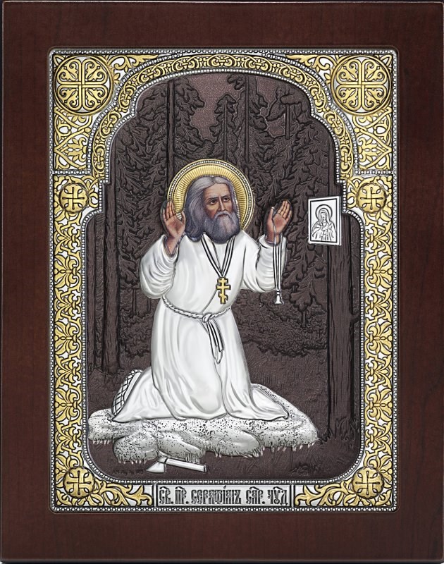 Его называли батюшкой при жизни, и это имя осталось навсегда — к нему приходят за утешением, за тихим советом, за силой продолжать, когда своей не осталось. Золотой оклад обрамляет фигуру святого, и серебристый фон будто хранит свет тех саровских лесов, где он стоял один перед Творцом.