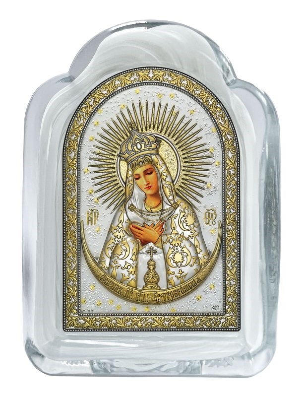Образ заключён в прозрачное стекло, словно под хрусталём. Золотое сияние вокруг лика напоминает солнечные лучи — они расходятся ровным кругом, создавая ощущение света, который льётся изнутри. Богородица изображена со склонённой головой и рукой на сердце, в молитве за всех, кто к Ней приходит.