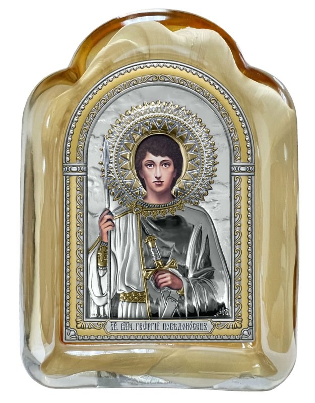 Серебристый оклад, мягкое сияние золотого нимба и взгляд, в котором нет ни суровости, ни напряжения — только ясность. Святой Георгий держит меч не как угрозу, а как напоминание: сила начинается там, где заканчивается страх. Стекло прохладное, края округлые, форма удобная — икона легко ложится в ладонь, словно была создана именно для того, чтобы её касались.
