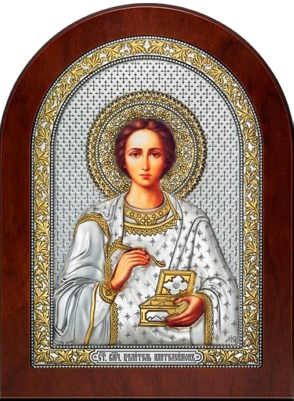Свет падает на серебристую поверхность оклада. Растительный орнамент образует тихий узор вокруг лика. В руках у святого ларец с врачебными инструментами — такими он лечил больных в Никомидии много веков назад.