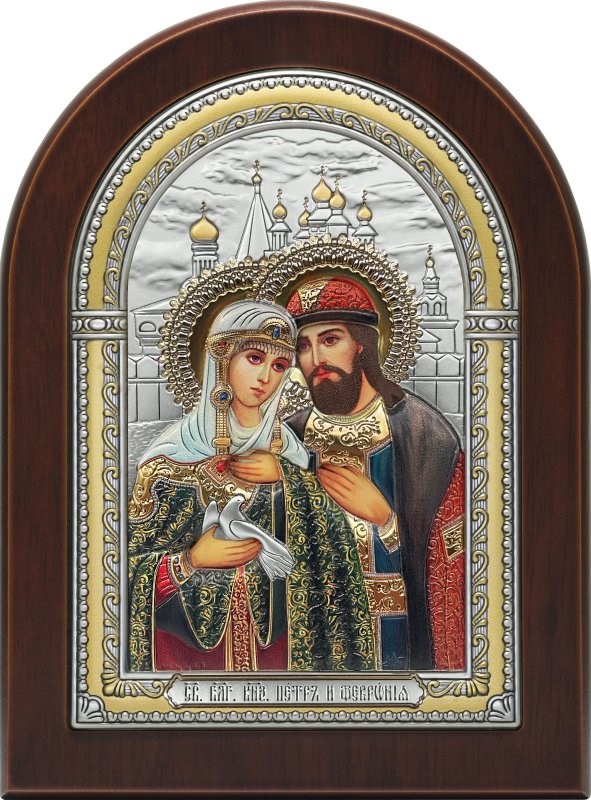 Икона выполнена на тёмном дереве, серебряный оклад мягко ловит свет. Её часто дарят тем, кто только начинает семейную жизнь, или тем, кто хочет укрепить то, что уже есть. Образ этот не про пылкие слова — он про то, как двое идут рядом через годы и не отпускают друг друга. Такая икона не требует особого места, она сама находит его в доме и остаётся там тихим напоминанием о верности.