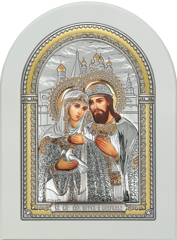 На этой иконе они изображены стоящими рядом, их фигуры обращены к молящимся, а жесты рук — одна к другой. Серебряный оклад с золотыми вставками подчёркивает строгость образа и его глубину. Лики написаны спокойно, без лишней экспрессии — в них читается та твёрдость, с которой князь и его супруга прошли через изгнание и бедность, не оставив друг друга.